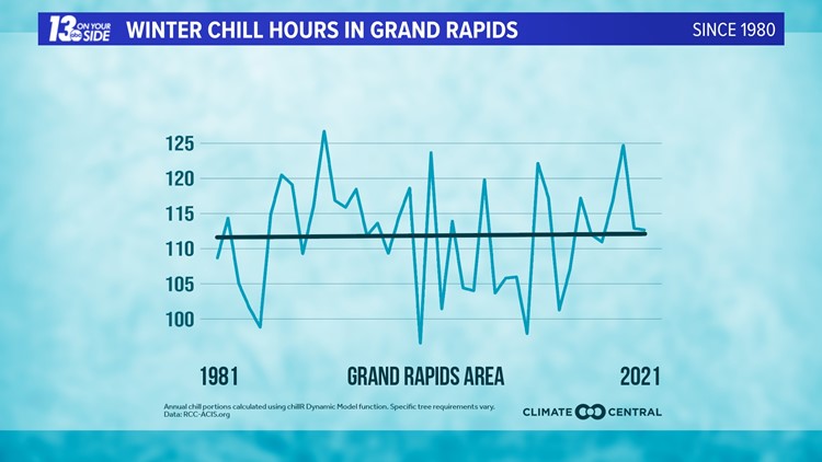 While some regions have had trouble reaching chill requirements thanks to climate change, Michigan is actually doing very well. Days with chill hours in our region have remained mostly stable through the last 50 years.